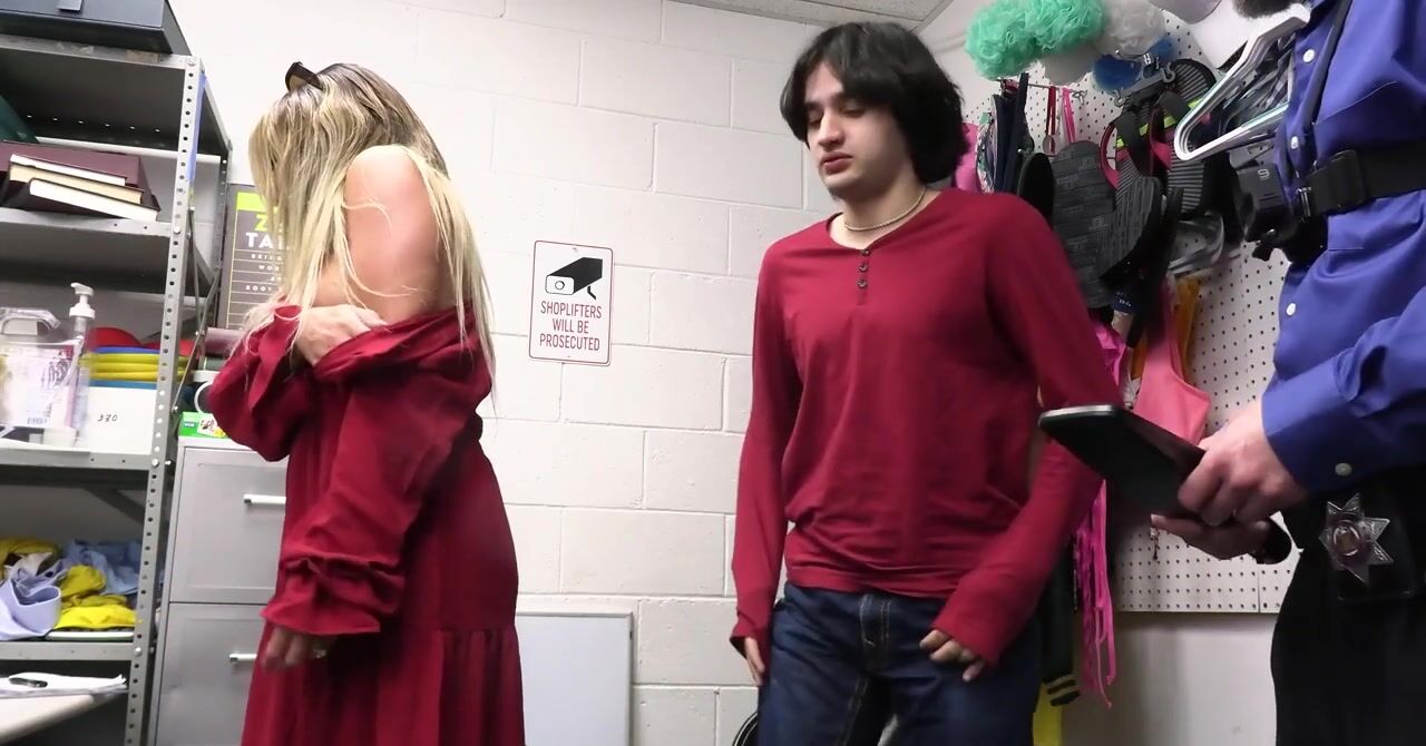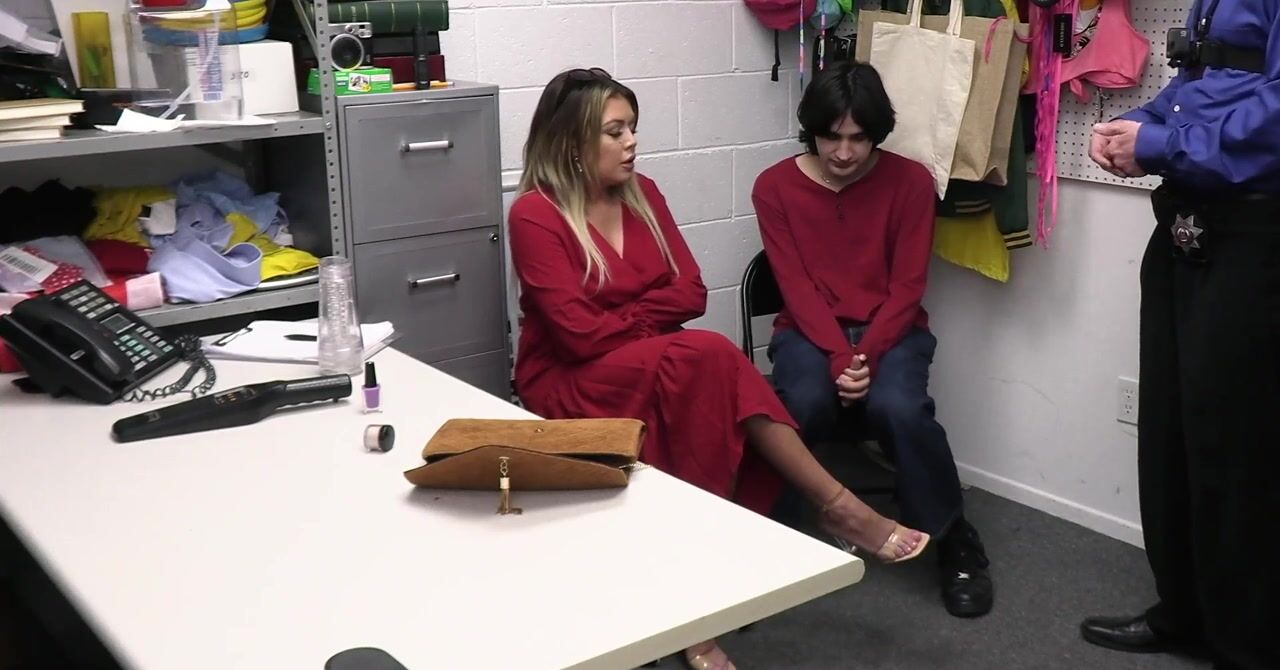 «Охранники видели, что белокурая зрелка своровала несколько вещей в магазине. Поэтому в подсобке они проводят досмотр и находят сворованное. А теперь милфа с силиконовыми сиськами должна из задобрить, чтобы охранники не вызывали полицию. Приходится сосать их члены и отдаваться в киску на столе. Пасынок, который всё это время был с ней рядом, не собирается стоять в стороне, он тоже достает хер и имеет мачеху.»
